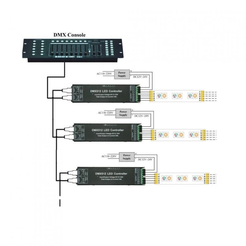 - This DMX512 LED Controller retransmits signals under standard DMX through 4 fixed RGBW channels (RGB+ White), allowing you to control the behaviour of your LED lights at all times.