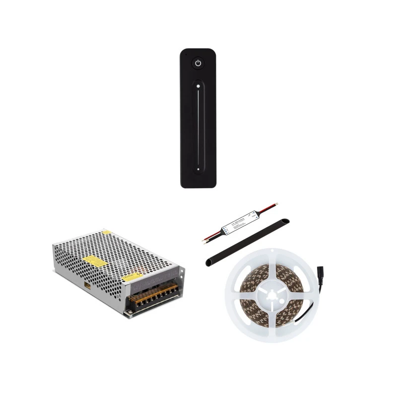 - Kit includes; 5Â meter Warm White LED strip, 1 x wireless remote control, 1 x push button power supply.