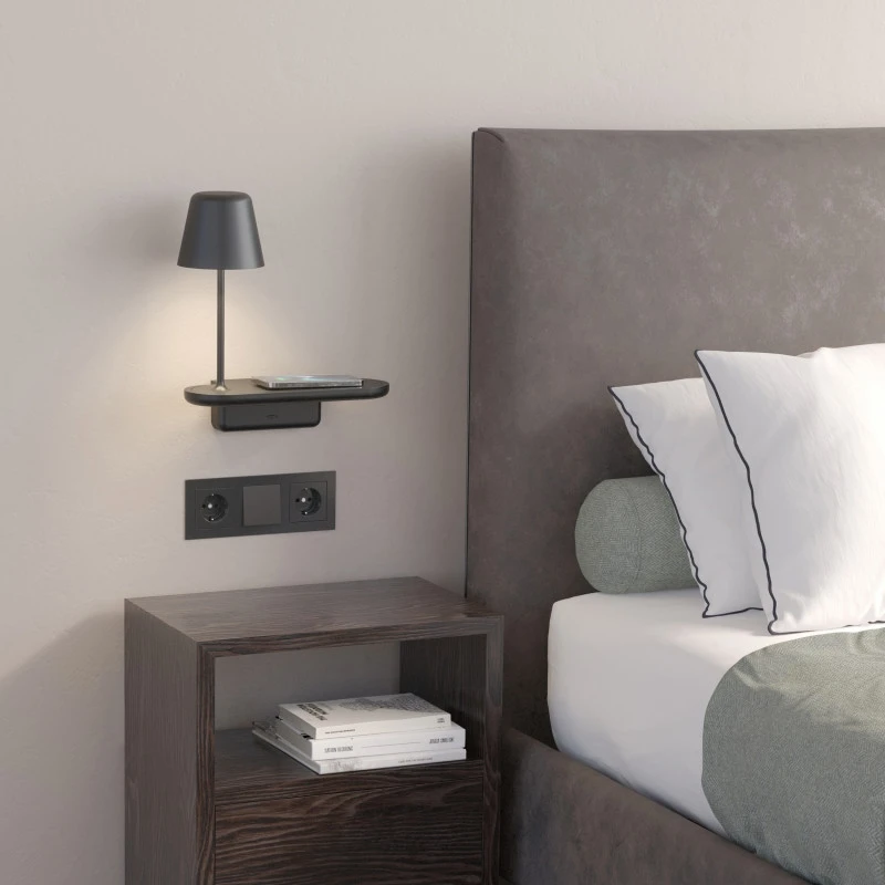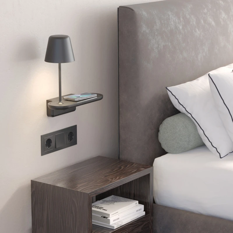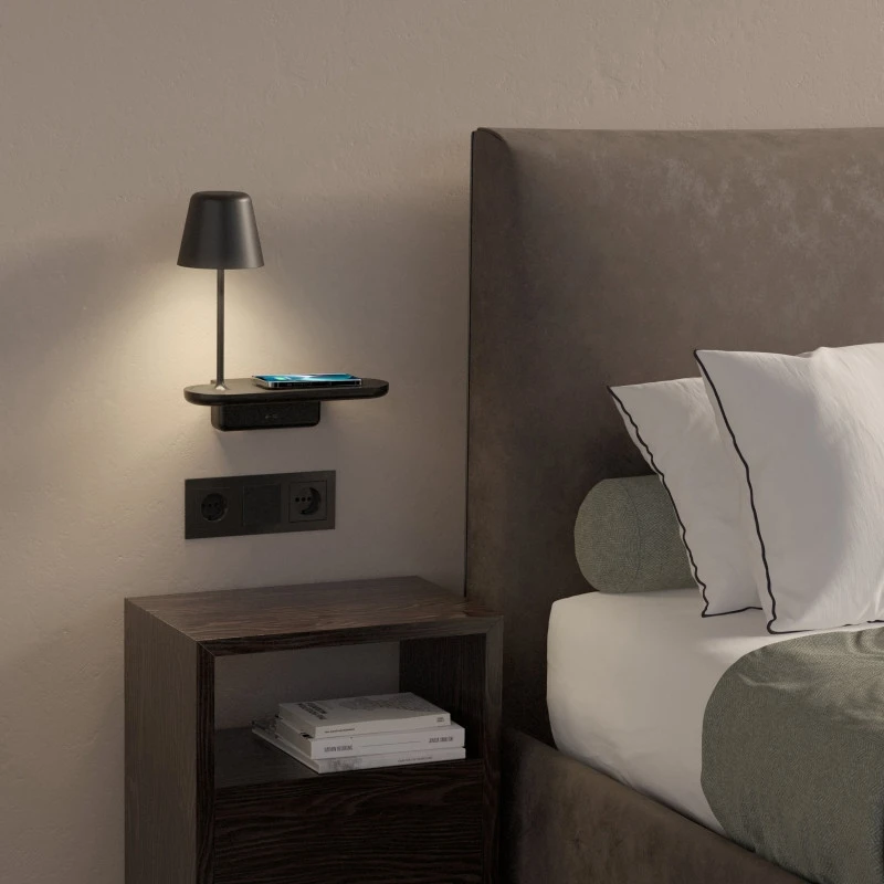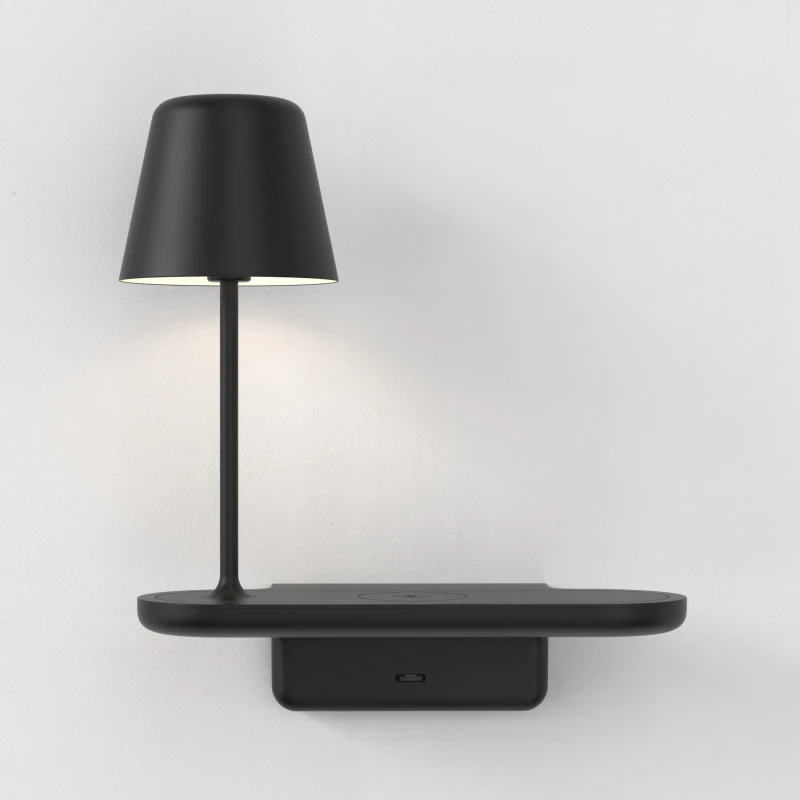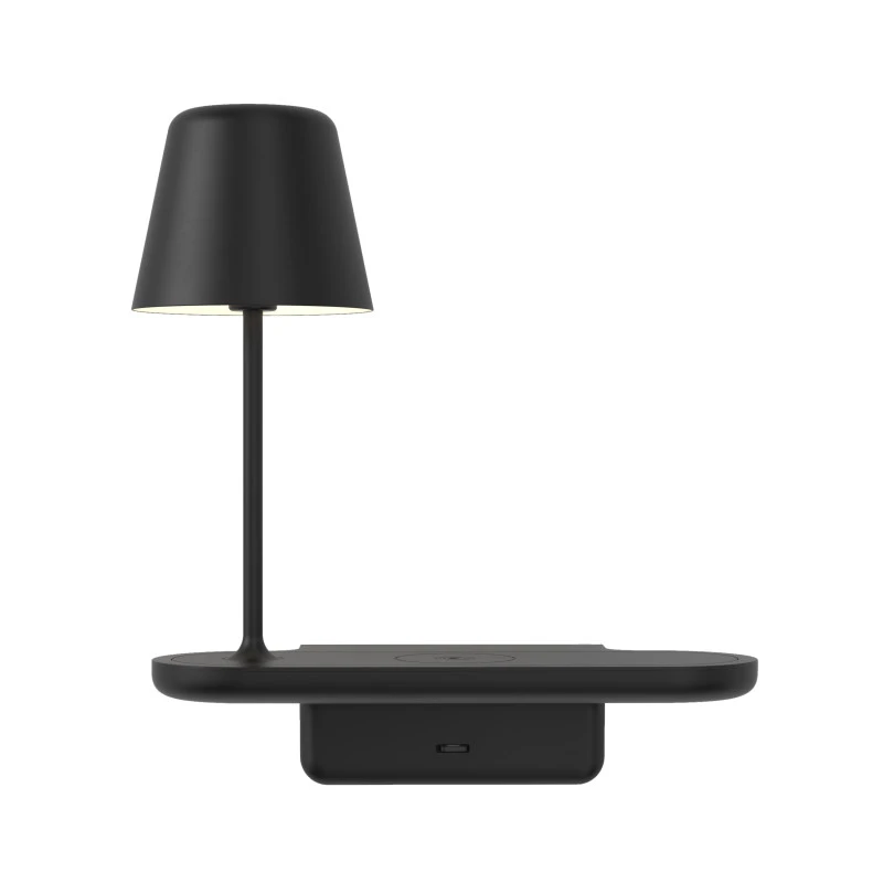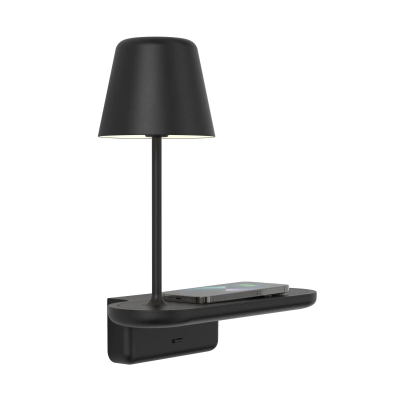 - A smart looking bedside lamp in a matt black finish with an integrated wireless docking station, an independent on/off rocker switch and USB charging port