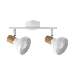 - A Nordic style 2 light ceiling spotlight fitting with white and beech-coloured metal spotlight heads which are adjustable, allowing you to direct light where required and a circular backplate. This is ideal for modern or contemporary decors and a great addition to your bedroom, living room, dining room or hallway.