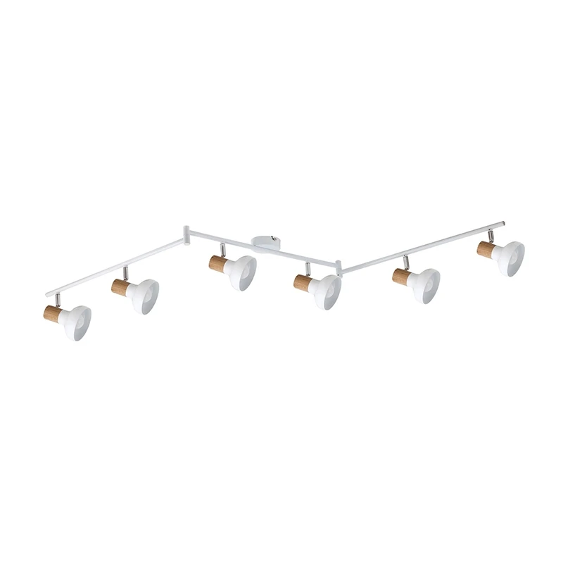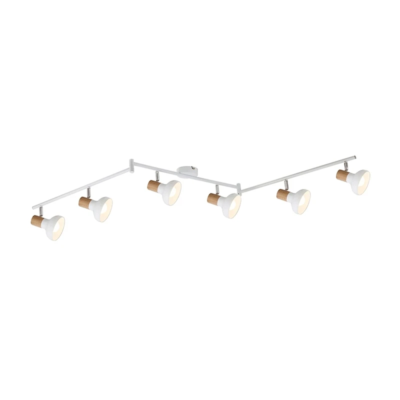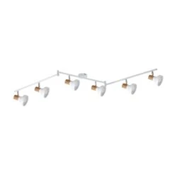 - A Nordic style 6 light ceiling spotlight fitting with white and beech-coloured metal spotlight heads which are adjustable, allowing you to direct light where required, adjustable arms and a circular backplate. This is ideal for modern or contemporary decors and a great addition to your bedroom, living room, dining room or kitchen.