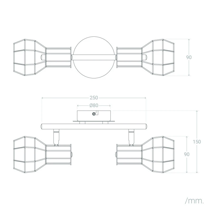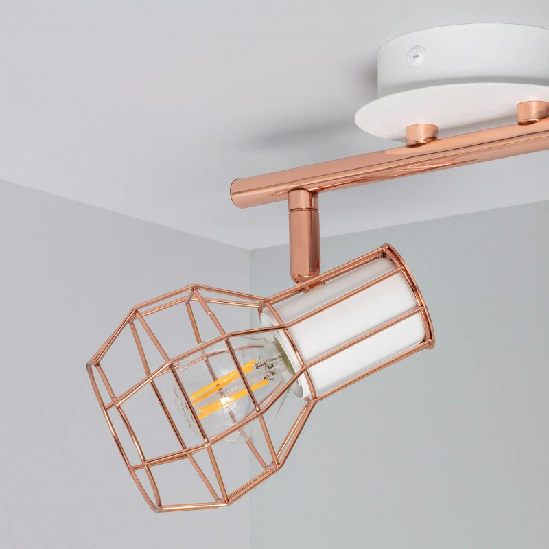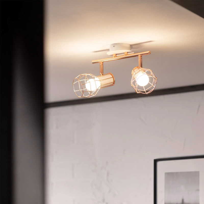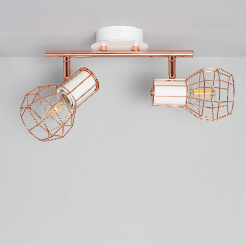 - 2 light adjustable ceiling spotlight bar with white ceiling plate and rose gold bar and open cage style shades