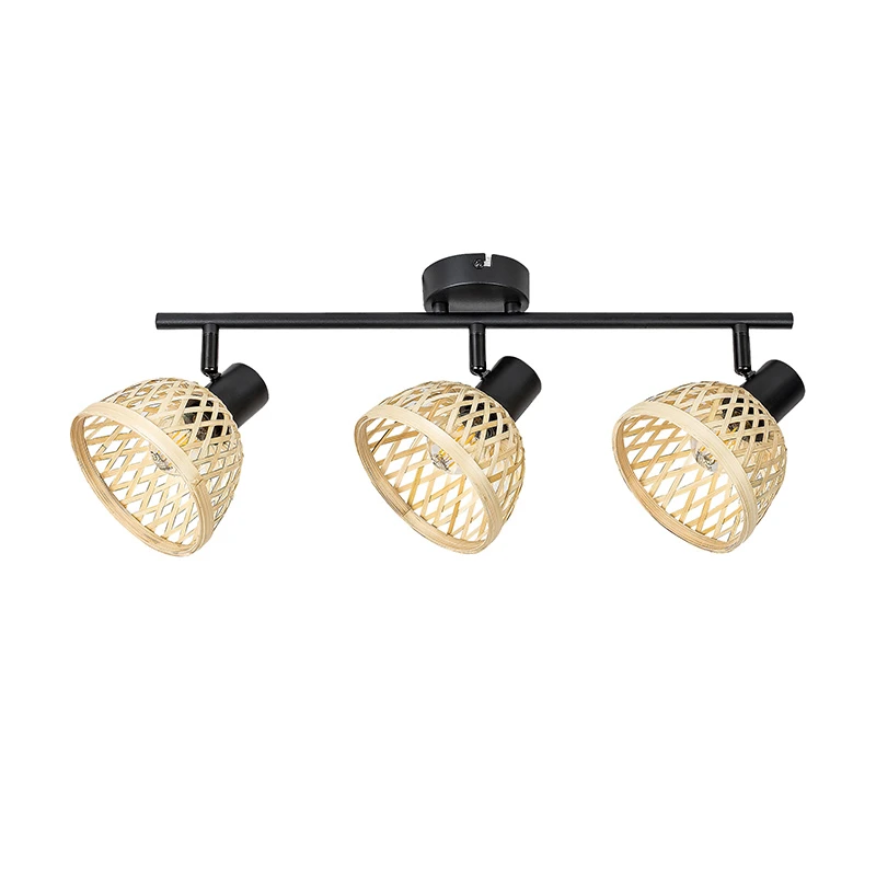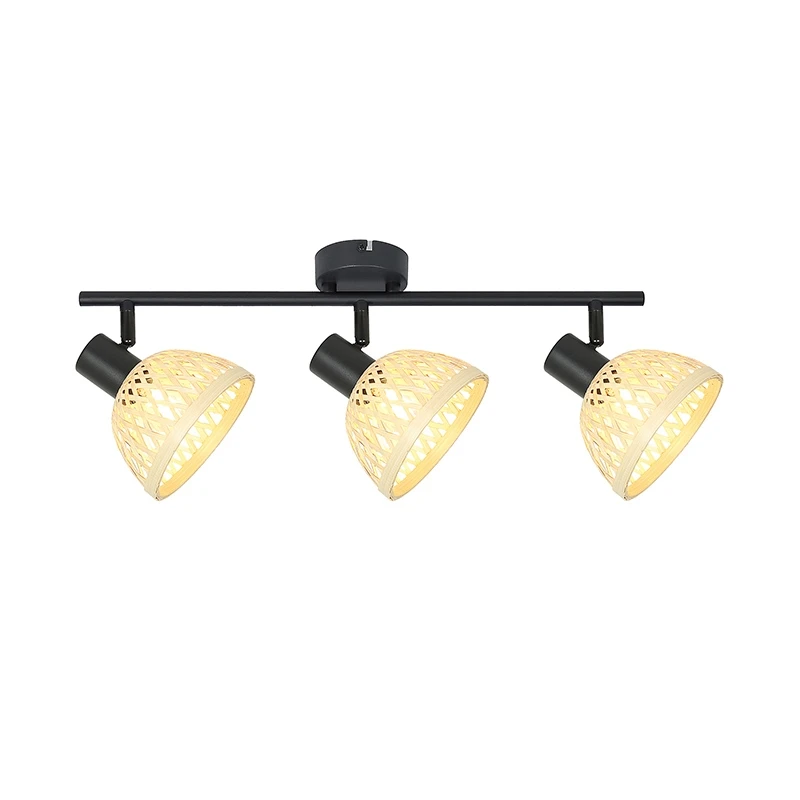 - This industrial style Rattan spotlight is ideal in the living room, dining room, kitchen or even in the bedroom. The matt black, metal back plate has a slender bar and is complemented by 3 dome shaped, adjustable lampshades made of natural rattan, allowing you to direct light where required and it can be wall or ceiling mounted.