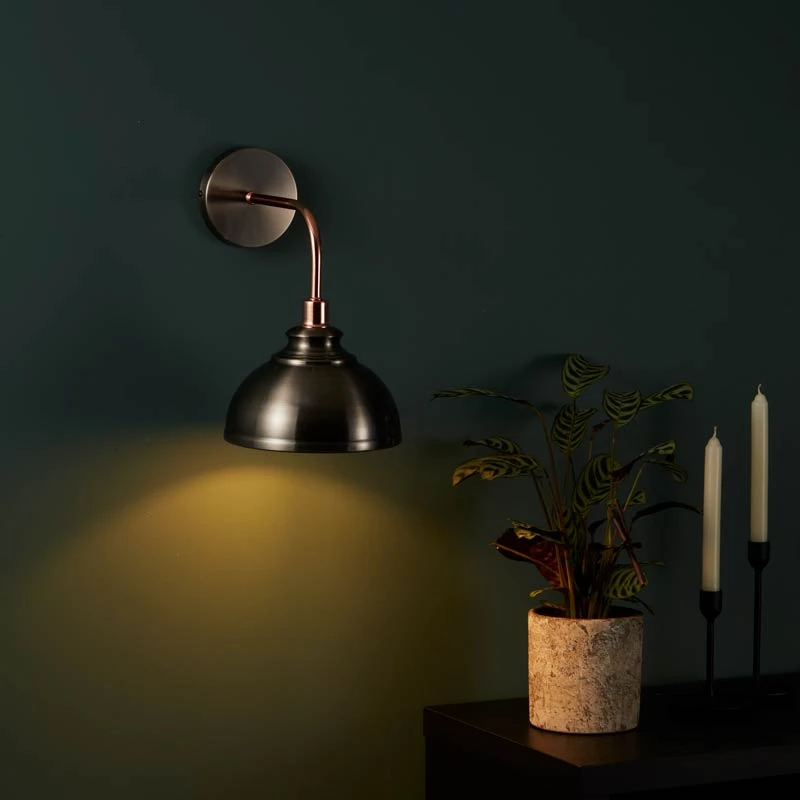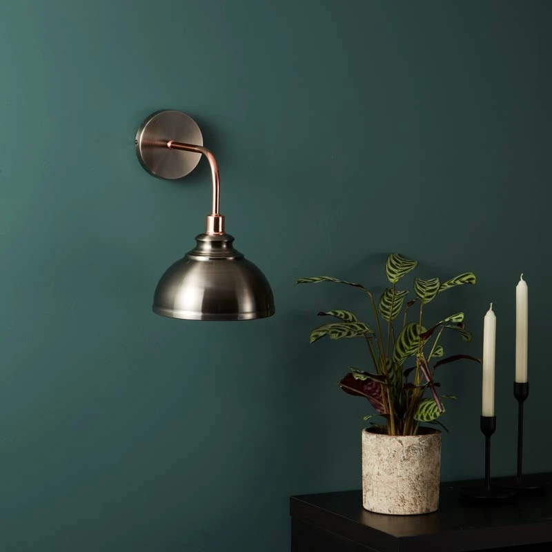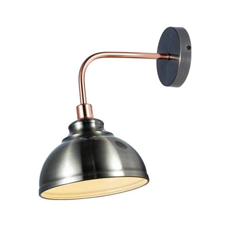 - Metal wall light in antique chrome finish with copper detailing and a white finish on the shade inner