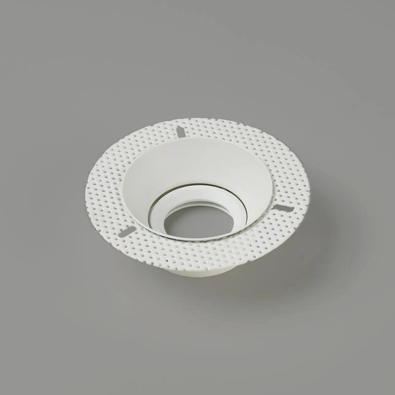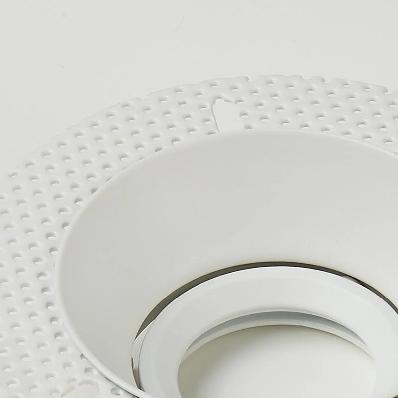 - This single light trimless recessed downlight has a circular fascia with adjustable spotlight in matt white finish and is designed to be installed before final plastering for a trimless finish.