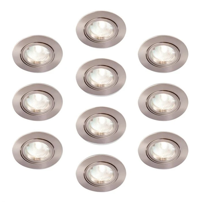 - Pack of 10 die cast aluminium adjustable downlights in a brushed chrome finish